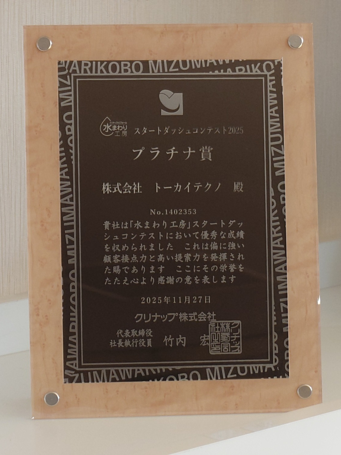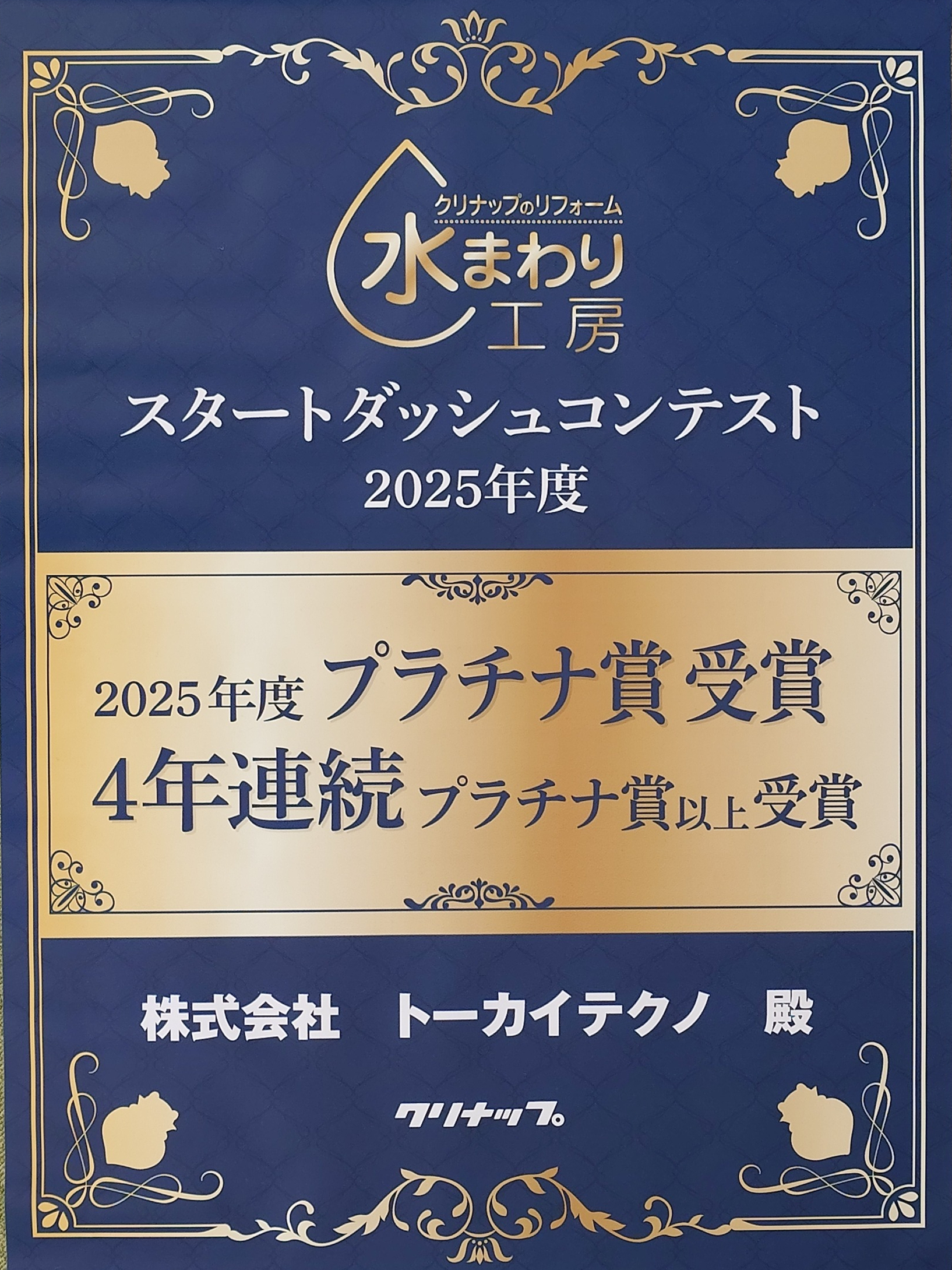 ▼クリナップ(株)様主催 「水回り工房 スタートダシュコンテスト2025」において、プラチナ賞を4年連続で受賞いたしました。