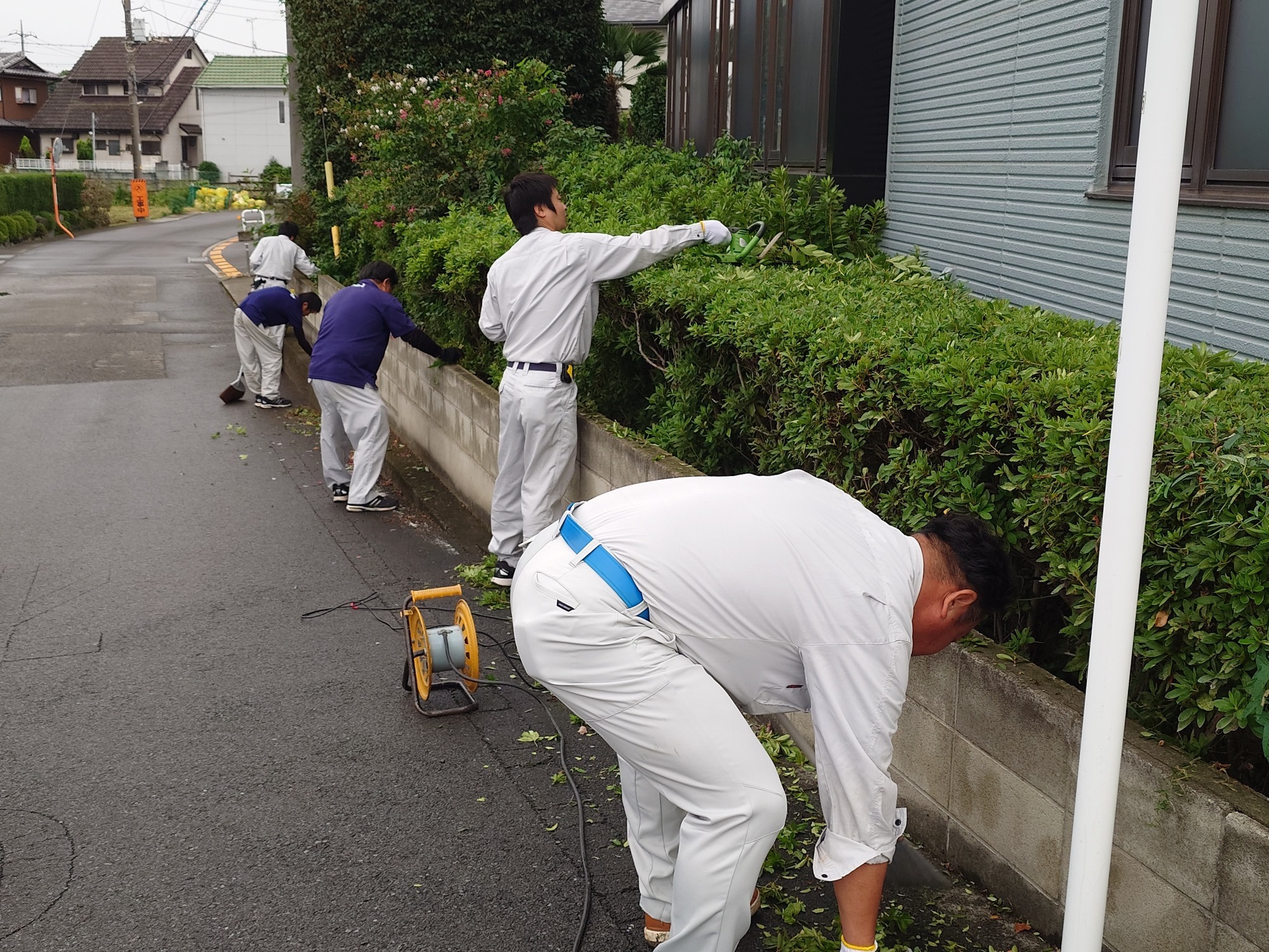 恒例の社外清掃ですが、今回は夏後の清掃にもかかわらず、暑かった事もあり、それほど草木の成長がありませんでした。近隣の迷惑にならないよう、車道へはみ出した植木の剪定、路面に生えている雑草をきれいにすることができました。
