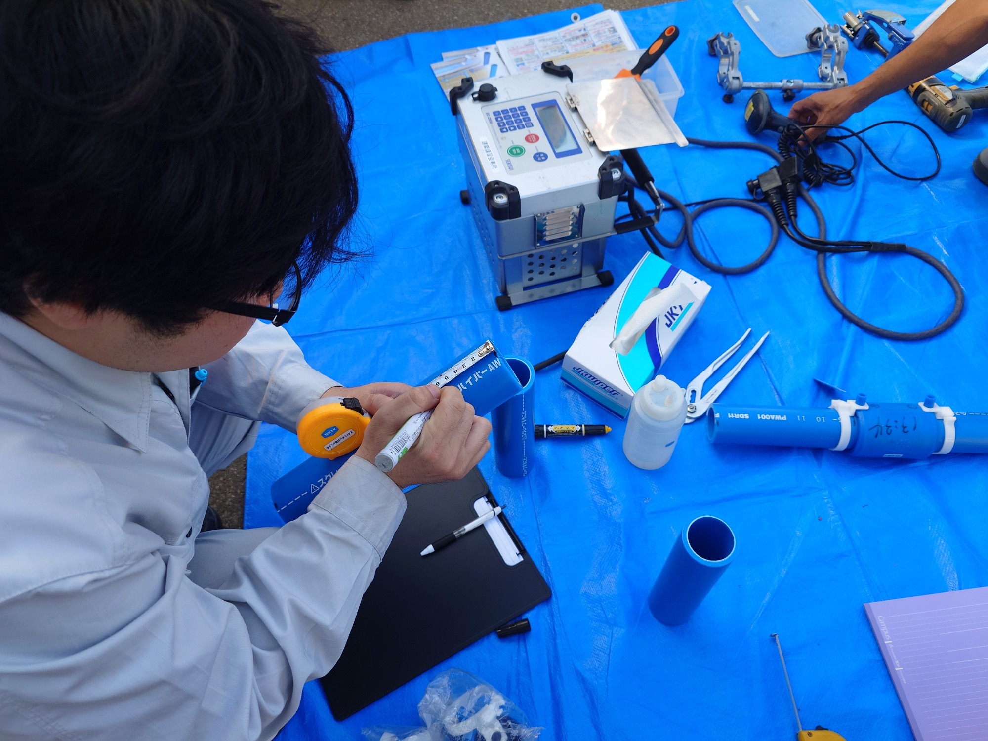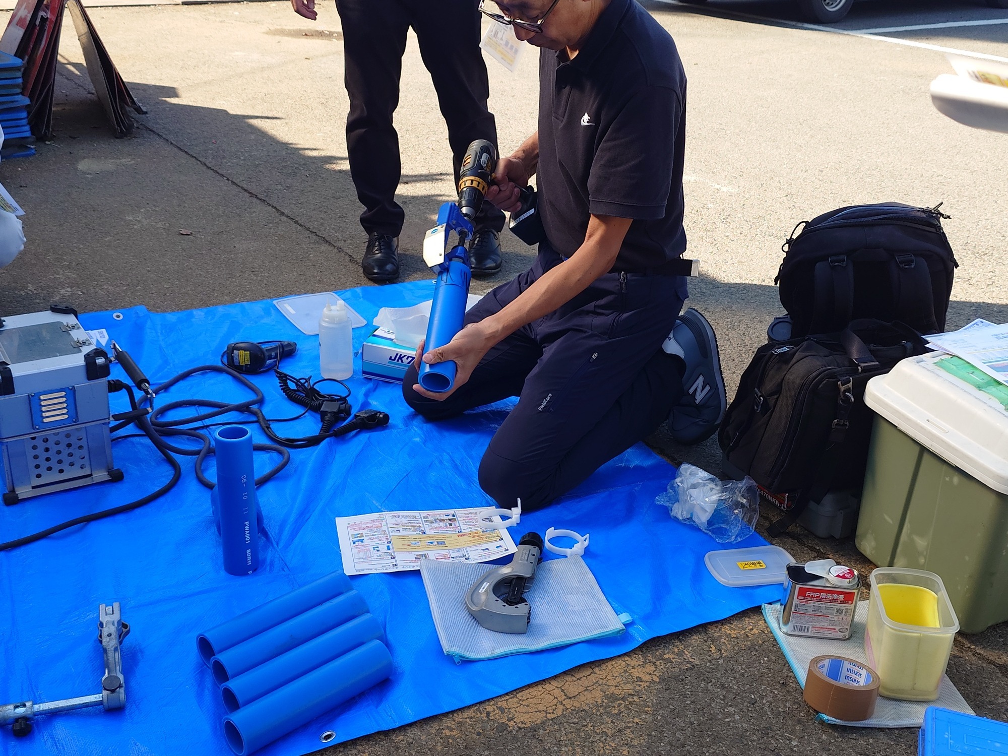 今回は、エスロハイパーシリーズ・EF継手の施工手順とポイントについて、実演をしながらの解説、注意点等を習い、実際に施工を体験しました。施工上、何が重要であるかを実際に体験し、融着不備のない施工方法を学習することができました。