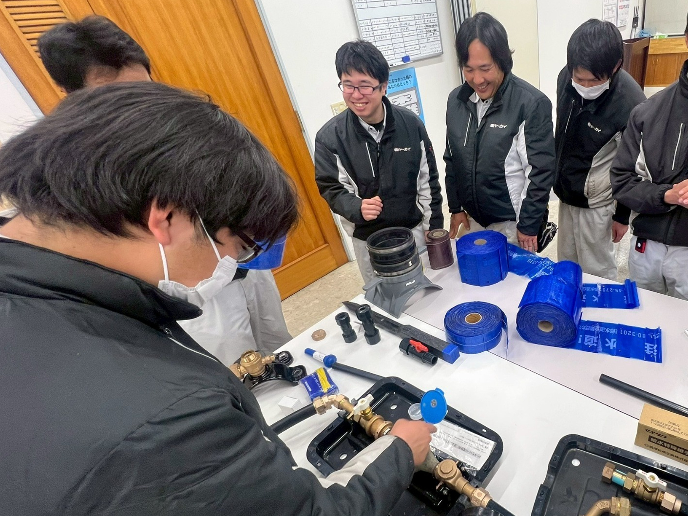 工具の使い方、塩ビ管の切断方法、シールテープの巻き方、組み上げるまでのポイント、なぜその材料を使うのかなど、初心者から現場経験者まで、熱心に取り組み無事予定通り組み上げる事ができました。